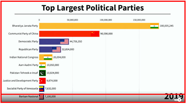 Apologies for that even further digression. Back to “the greatest political party on Earth” – by registered party membership. The principle is the same as for ‘Largest Armies’ – annually reported, with the totals, bar lengths and positions constantly changing, starting here in 1950, rather than 1816; checked and validated as much as possible, which explains the present-day absence of the Communist Party of the Soviet Union. Missing too is the UK Conservative Party – because, well, you can guess from all the other figures running into the several millions how far down the list its 172,437 would be.