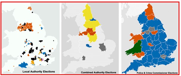 MAP 1 shows LOCAL COUNCIL ELECTIONS, and indeed occupying this year perhaps about an eighth of the England part of the map – as this is a ‘non-county’ year, with no Welsh council elections.