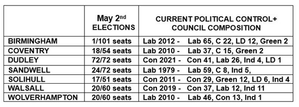 In our still substantially ‘two-tier’ county-district local government system, next Thursday’s elections are for the minority of English district and unitary councils who elect their councillors by thirds or halves, rather than all-out, and for mainly single-tier metropolitan boroughs – smallish in map-area, but with big, concentrated populations, and most of which (Birmingham is an exception) still elect a third of their councillors in three years of each four-year cycle.