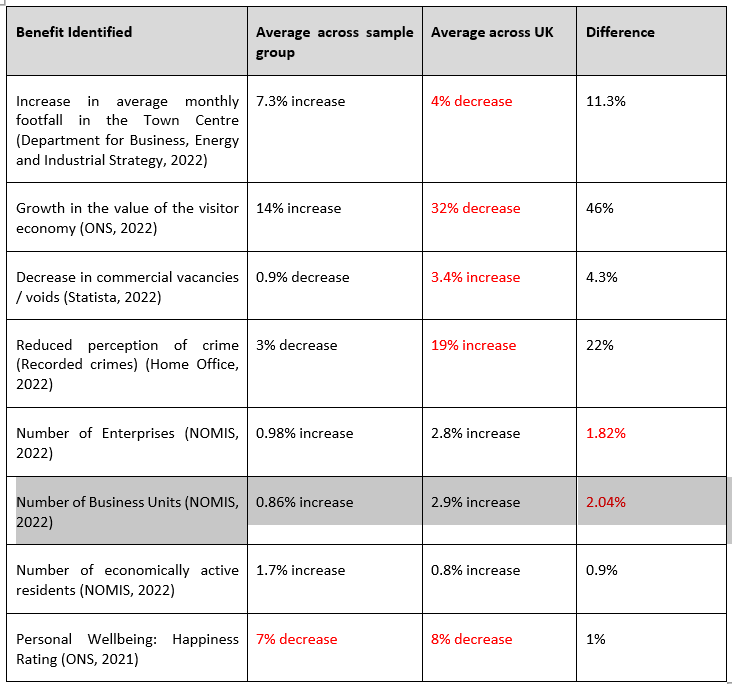 However, in other areas, the sample group outperformed the UK average. These authorities saw smaller decreases in resident happiness and commercial property voids, a significant reduction in recorded crimes, and greater increases in economically active residents. Notably, they experienced substantial growth in the visitor economy and footfall, likely influenced by increased domestic tourism during the COVID-19 pandemic, which affected international travel.