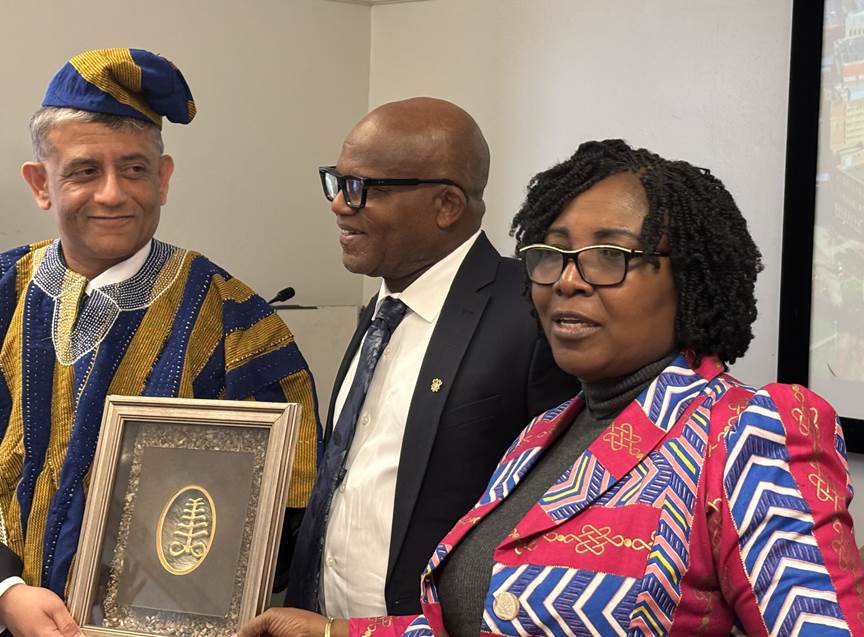 The Head of the Ghanian Local Government Service, Dr Stephen Nana Ato Arthur and the Chief Director of the Office of the Head of the Local Government Service, Madame Felicia Dapaah Agyeman-Boakye, honouring Shailen at the end of the CPD in Edgbaston.