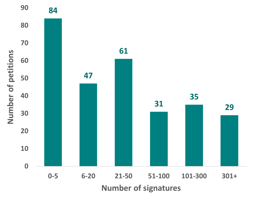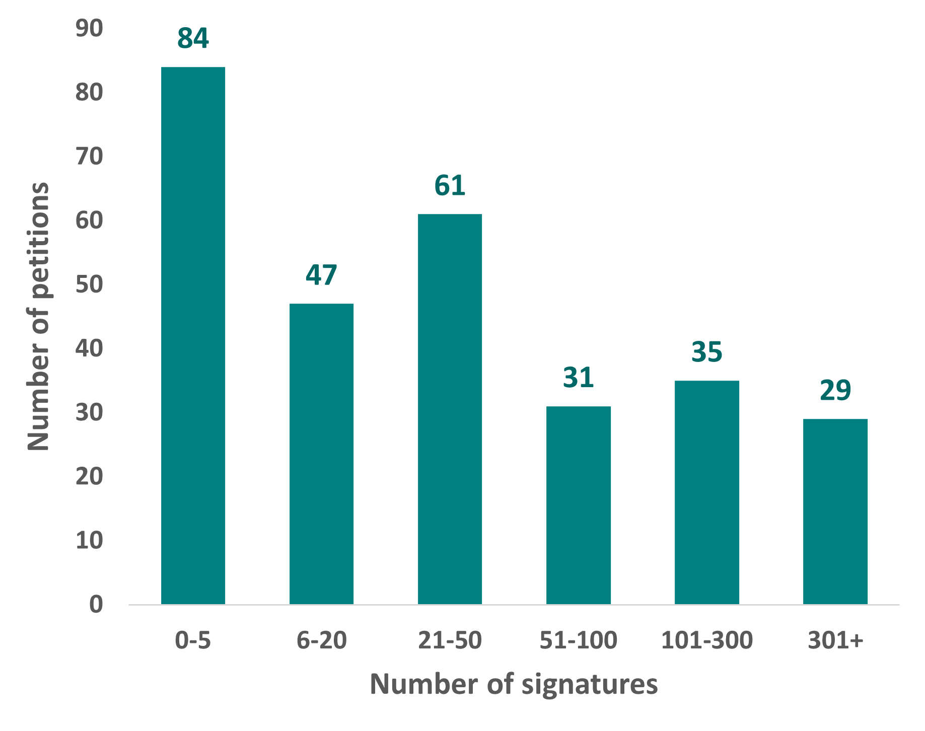 Chart 1 below presents information on the number of signatures received per petition. Most received relatively few signatures, with 26 being the median number of signatures. However, a few received very high numbers – 11 petitions across all boroughs received more than 1,000 signatures – bring the mean number of signatures per petition up to 187.